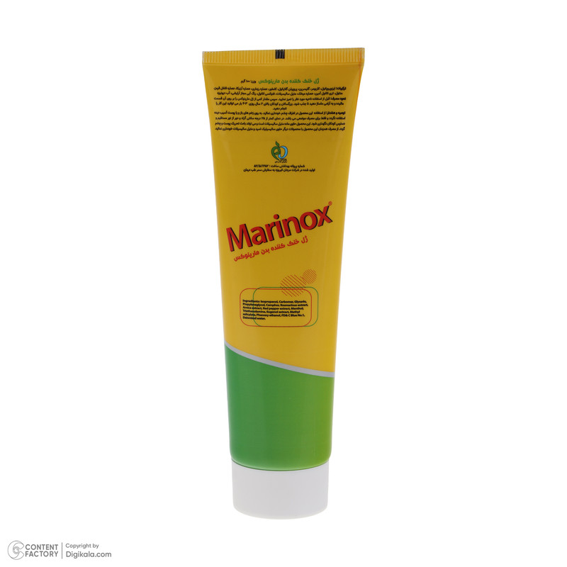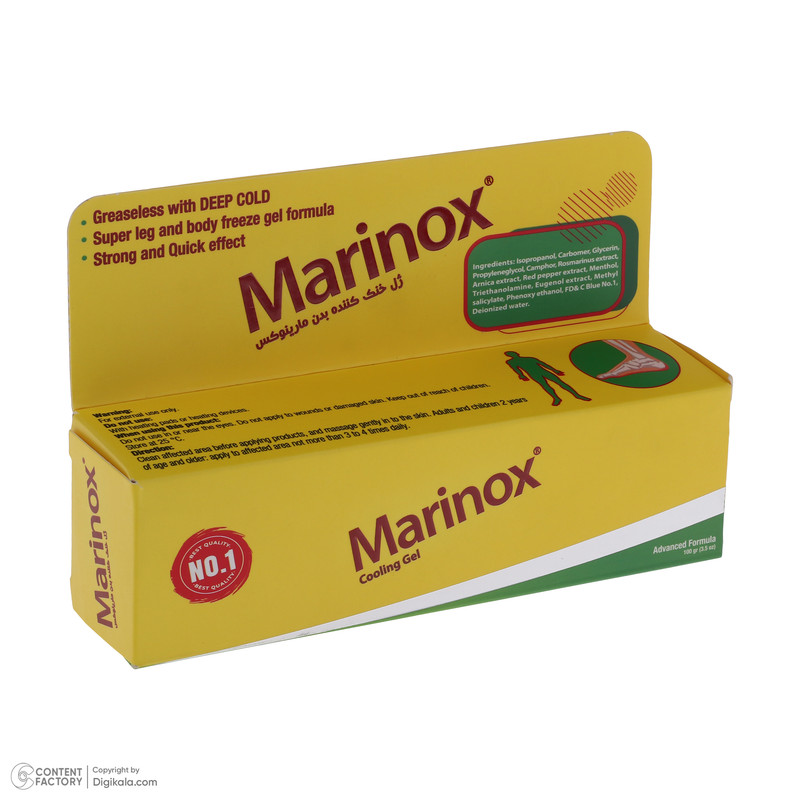 سایر توضیحات : لیست ترکیبات ژل مارینوکس برای گرفتگی عضلات : ایزوپروپانول، کربومر، گلیسیرین، پروپیلن گلیکول، کامفور، عصاره رزماری، عصاره آرنیکا، عصاره فلفل قرمز، عصاره میخک، متیل سالیسیلات، فنوکسی اتانول، رنگ آبی مجاز آرایشی و آب دیونیزه.